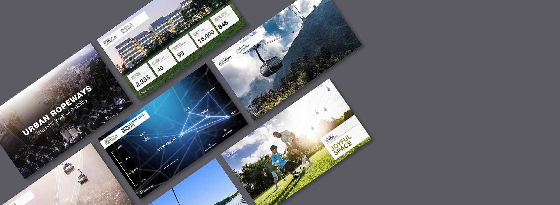 In order to represent and promote Doppelmayr's emerging urban ropeway business in the best way possible, a new and fresh presentation concept was created. The focus was set on a clean and modern presentation layout with engaging, full-screen images. A combination of atmospheric visuals and dynamic elements communicates the content optimally and also speaks to the viewer on an emotional level. From font sizes, colour concepts and layout options to the image and graphic style, a comprehensive presentation system was developed. The created template document can be used by every employee in the company due to partially editable elements and corresponding explanations - all while ensuring a high visual quality. In addition to the templates, exemplary content was developed to define the desired imagery and colour scheme.