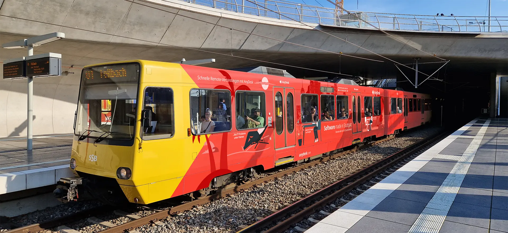 Als Awareness Kampagne für AnyDesk wurde eine vollständige Außenbeklebung einer Straßenbahn der SSB (Stuttgarter Straßenbahnen AG) konzipiert. Ziel war es, den zentralen Nutzen der Fernwartungssoftware – ortsunabhängiges Arbeiten – visuell darzustellen. Die Gestaltung nutzt die Bahn als symbolisches Element: Während sie üblicherweise für den Arbeitsweg steht, betont die Kampagne, dass dieser durch Remote-Arbeit überflüssig werden kann. Die Fahrgäste werden dabei unbewusst Teil der Inszenierung und unterstreichen den Kontrast zwischen physischer Mobilität und digitaler Flexibilität. Konzeption und Umsetzung erfolgten in enger Abstimmung mit dem AnyDesk-Team. Das Ergebnis ist eine aufmerksamkeitsstarke, mobile Werbefläche, die die Markenbotschaft klar und einprägsam kommuniziert.