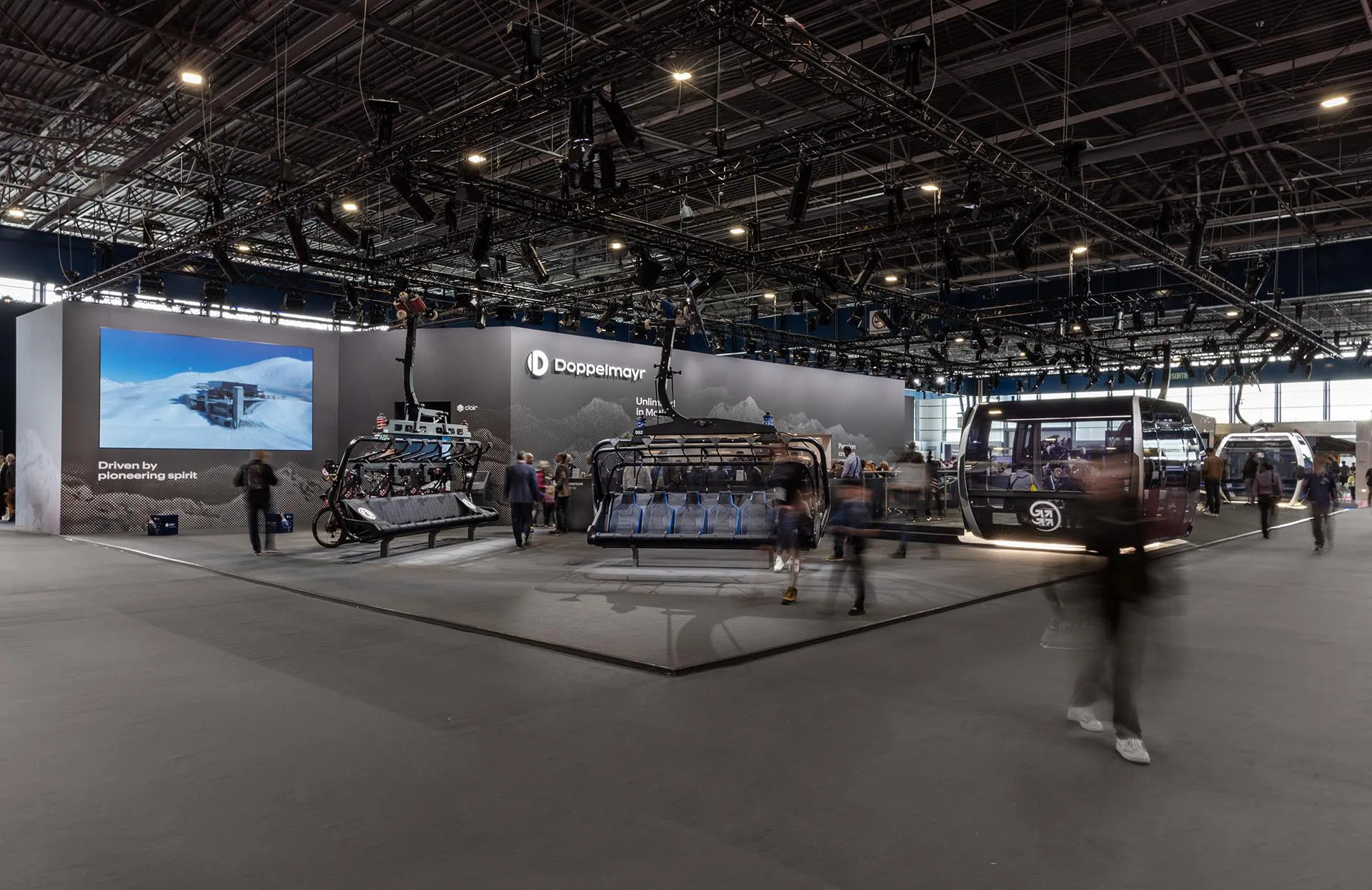 Im Jahr 2024 fand in Grenoble, Frankreich, die 50. Mountain Planet Messe statt. Einer der bedeutendsten Aussteller war dabei erneut die Doppelmayr-Gruppe – mit einem Messestand, dessen Grundkonzept bereits 2019 von uns entwickelt wurde. Der Messestand basiert auf einem modularen System, das ein variables Layout und viele Freiheiten ermöglicht. Dadurch ist er nachhaltig einsetzbar und flexibel an unterschiedliche Nutzeranforderungen anpassbar. Trotz dieser hohen Variabilität bleibt das charakteristische Erscheinungsbild der Marke durchgehend erhalten. In Grenoble kam der Messestand ein weiteres Mal zum Einsatz und wurde speziell auf die Anforderungen der Mountain Planet sowie auf die neue Corporate Identity von Doppelmayr angepasst. Speziell die Grafiken auf der Ausstellungsrückwand und die Animation für eine LED Leinwand, um das autonome Seilbahnsystem AURO vorzustellen, kamen in neuer Form zum Einsatz.